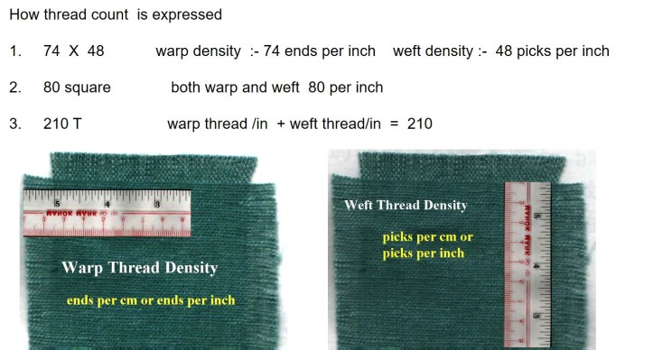 Thread count of the fabric or “T” or TPI of the fabric is actually the sum of warp density/inch and weft density/inch. Therefore, the thread count or T or TPI of the fabric can be calculated and expressed as shown in figure below.